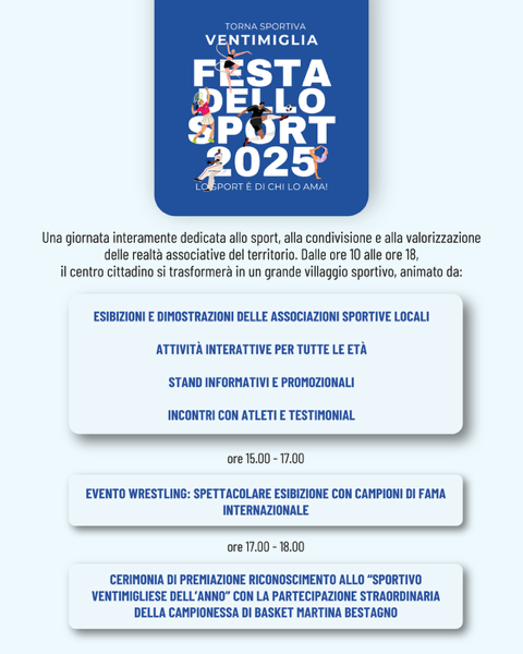 🏆 Alle ore 17.00 la cerimonia di premiazione dello “Sportivo Ventimigliese dell’anno” con la straordinaria partecipazione della campionessa di basket Martina Bestagno.